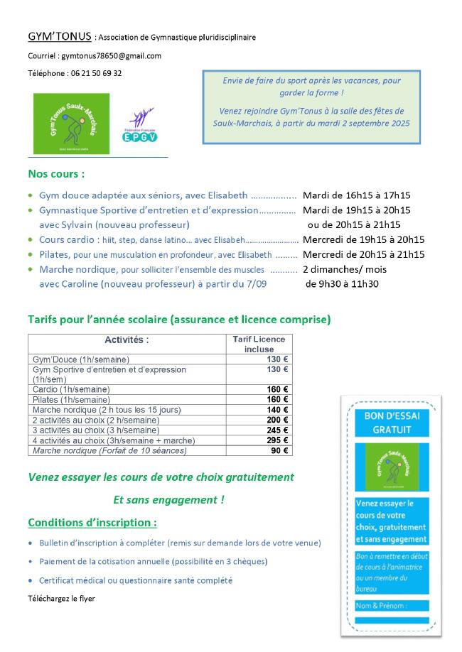 Contact et renseignements : 06 21 50 69 32 gymtonus78650@gmail.com
